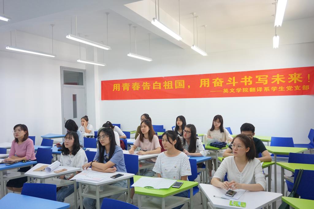 翻译系员工党支部书记从民族视野、世界格局和青年视角三个层面剖析了“时代”的深层内涵,结合自身实际出发,用亲身体会真诚告白新时代伟大祖国。员工党员们则结合暑期的志愿活动、实习求职经历以及对近期时事热评的思考几个方面抒发自己的爱国情怀。员工党员潘卓彦从“爷爷的故事”讲起,以爷爷46年老党员的故事讲述新中国成立70周年来中国变化发展;员工党员李萍就“习近平总书记给中青年干部的讲话”谈及感想,认为我们党正面临着发展带来的机遇及变革所带来的挑战,在前进的道路上我们青年学子要时刻做好准备;员工党员万怡婷则针对近期香港问题,表示员工党员应具有家国情怀、理性思考、冷静处理,为祖国的和平统一与发展贡献自己的一份力量。