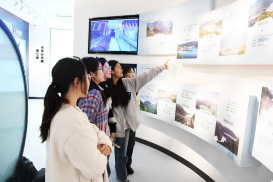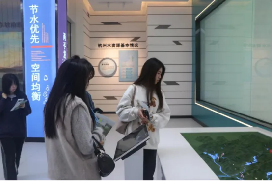 在工作人员的带领下,一行人参观了杭州市节水宣传基地,通过场馆介绍、节水知识问答等环节,大家对杭州市水利工作的历程和现状有了更全面的了解,对习近平生态文明思想有了更深刻的体悟。