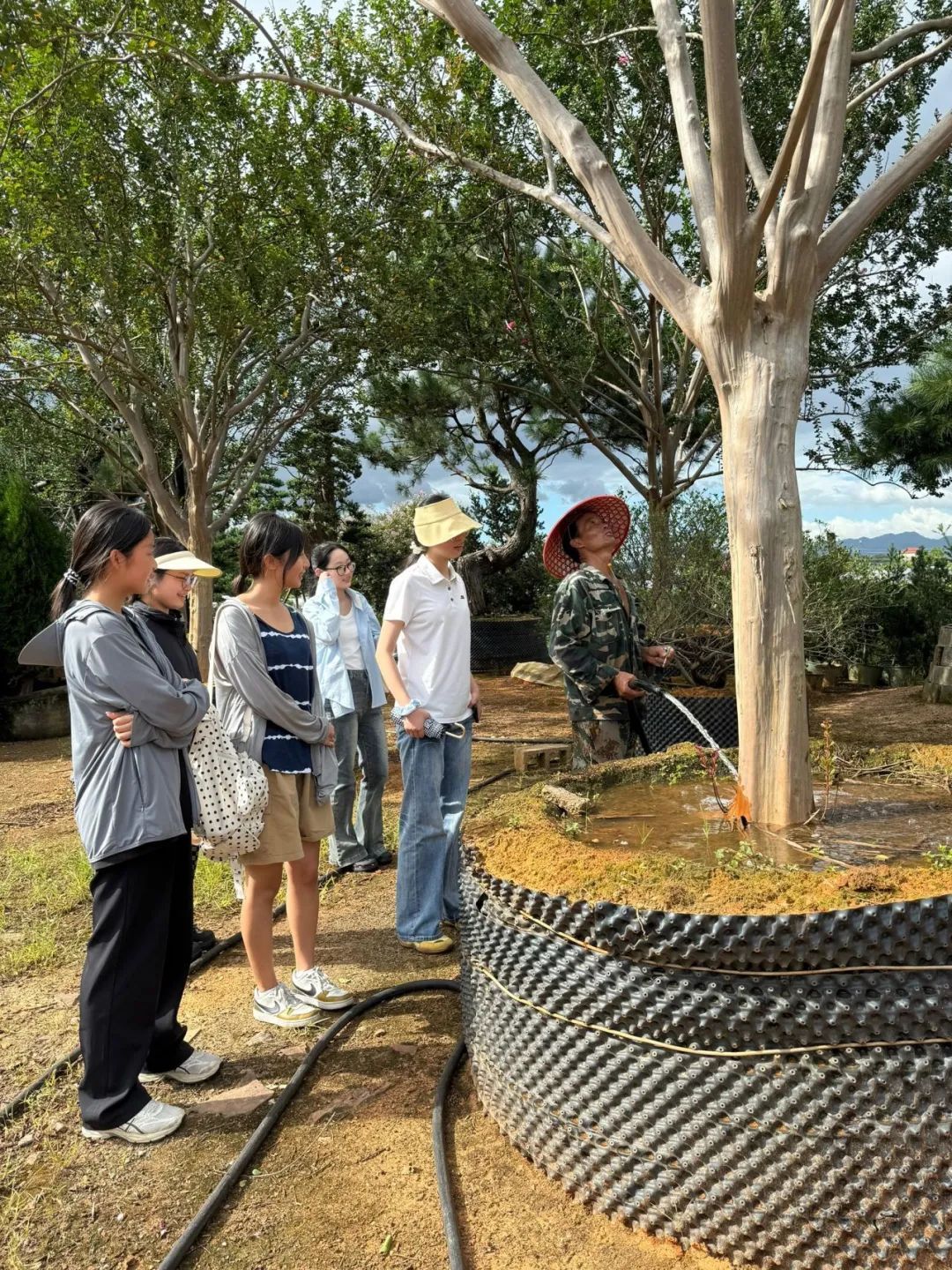 团队实地走访了曹宅镇盆景示范带,在这条没有围墙的“盆景长廊”里,五针松枝干粗壮黝黑,松针堆叠投下菱形光斑;真柏虬枝盘曲,树皮裂痕里透着青苔;紫藤新枝铝线定型,枝桠伸展。同学们向园丁请教修剪罗汉松的方法,听其介绍盆景既显现力度又不失灵动的方法。