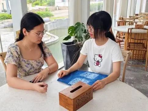 “雕花夹布浸,蓝白相于间。”在展馆互动区,徐老师坐下来与同学们面对面交流,谈话间更体现了制作蓝夹缬成品的非遗传承人的辛苦与伟大。她从染料发酵的刺鼻气味讲到三伏天曝晒的辛苦,从纹样设计讲到市场困境,让成员们直观感受到非遗传承人 “择一事,终一生” 的执着与伟大。