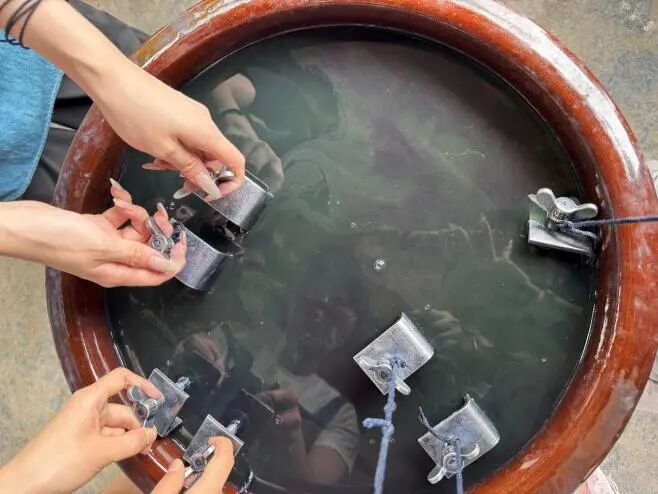 成员们亲身跟着老师学习起缸、浸染、晒晾,通过这一步步古老的工序,体会属于非遗的传统魅力。蓝靛草发酵着清香,成员们将印好花纹的土布浸入发酵半月的蓝靛草汁,提竿时水珠坠成靛蓝的帘,年轻的手掌抚过浸满靛蓝的土布,晾晒在竹架上的布匹在阳光下渐渐从淡绿色氧化为宝蓝色。这项延续千年的印染技艺,在暑期实践的课堂里焕发新的生机。