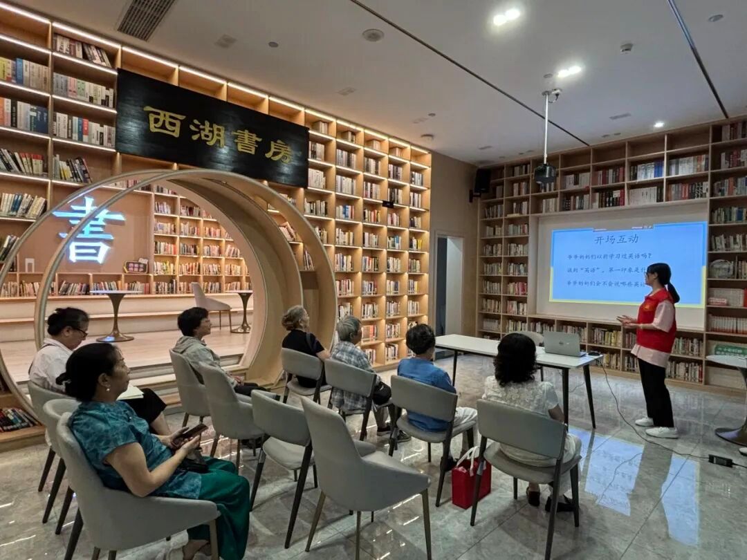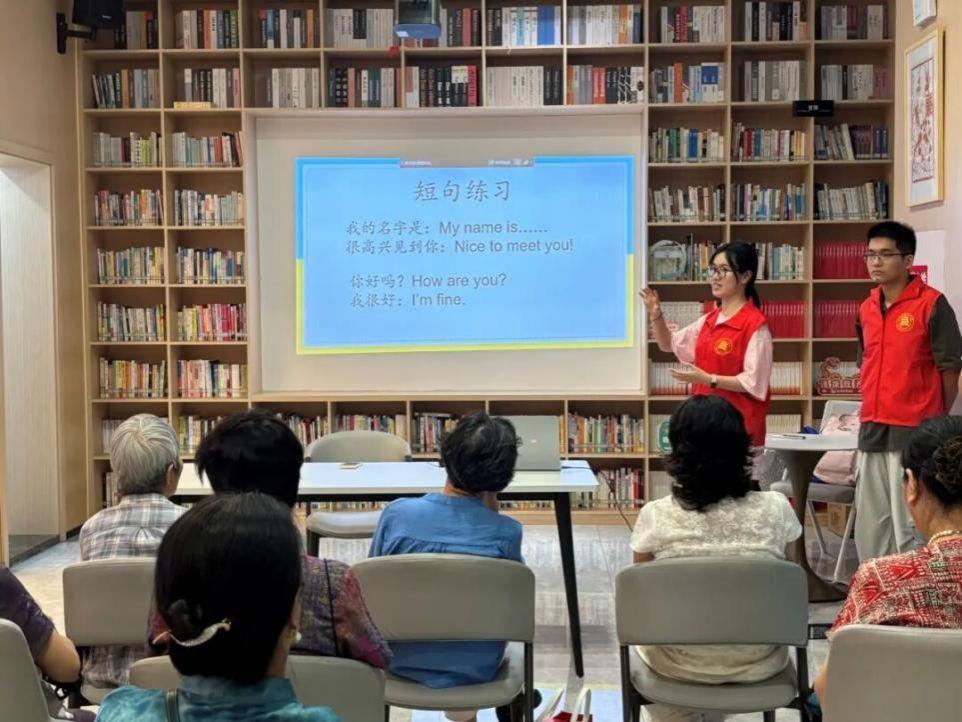 近日,“银龄乐学”beats365唯一官网入口官网赴西湖书房实践团走进西湖区翠苑街道保亭社区西湖书房,开展了一场别开生面的“银发英语角”主题活动。团队成员充分发挥英语专业特长,为社区老年居民带来了一堂精彩纷呈的英语启蒙课,用实际行动践行新时代青年的社会责任与担当,助力老年教育共富与精神共富。