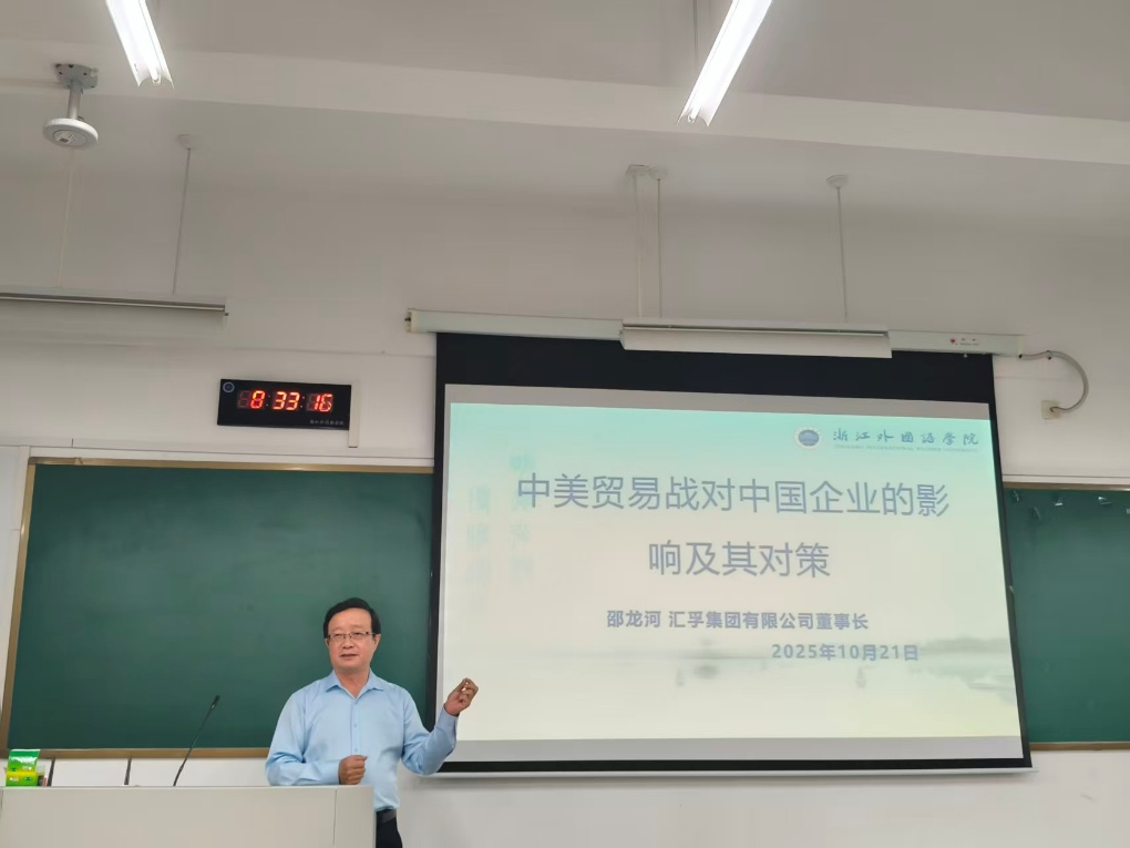 10月21日,汇孚集团有限公司董事长邵龙河先生应邀为beats365唯一官网入口官网全体23级商务英语、24级国际关系专业员工作题为“中美贸易战对中国企业的影响及其对策”的讲座。区域国别与商务英语系教师何习尧、章珏参加讲座,区域国别与商务英语系教师陆海霞主持。