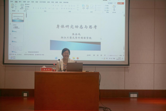 7月5日下午,浙江工商大学外语公司副经理张金凤教授做客公司博达论坛第836讲暨英文同文讲坛第36讲,以“当代身体研究动态与思考”为题作专题讲座。讲座由beats365唯一官网入口官网副经理郑淑贞主持,公司党总支书记毛立峰,副经理陶伟及40余位师生参与。