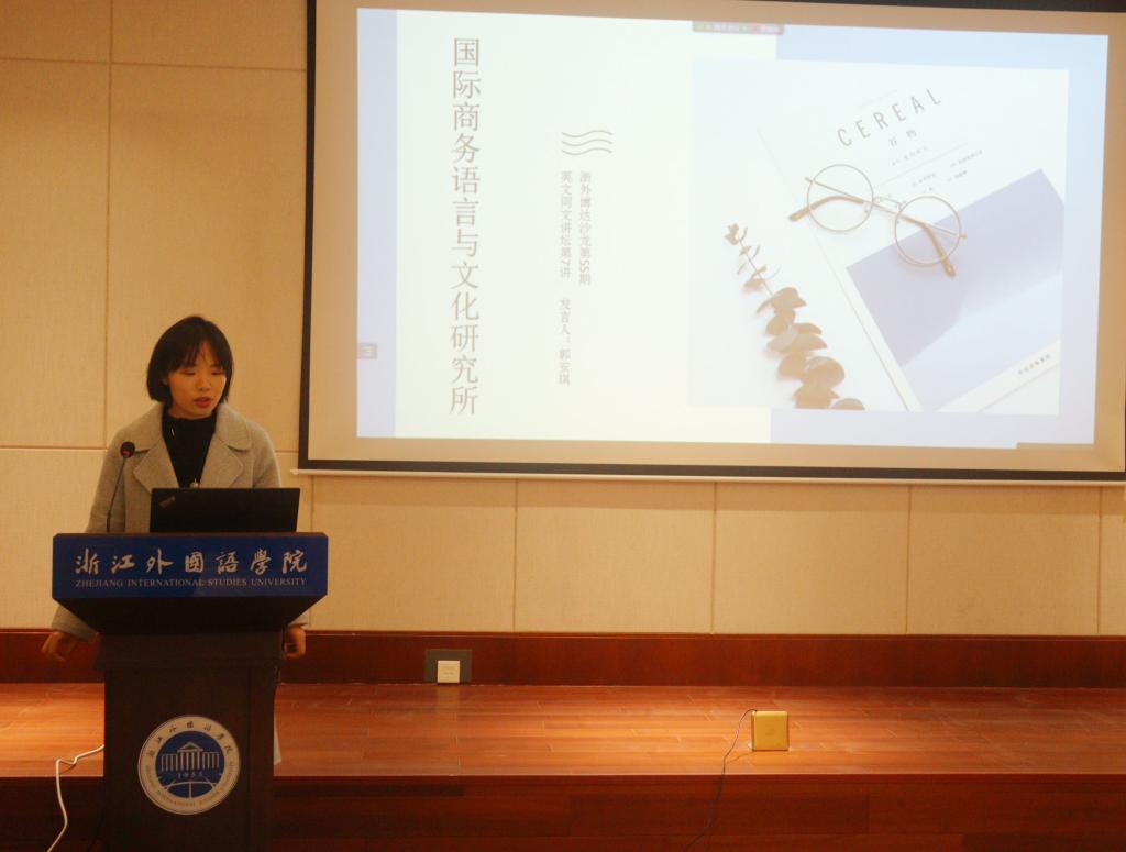 国际商务语言与文化研究所副所长郭安琪博士阐明了研究所的定位、愿景和使命,阐释了研究所的核心价值观是成就社会、成就企业、成就自我、坚守真理、厚德载物、团队合作。她指出,未来研究所的新使命和新愿景是为科研赋能,为学术成果赋予应用价值和社会价值。