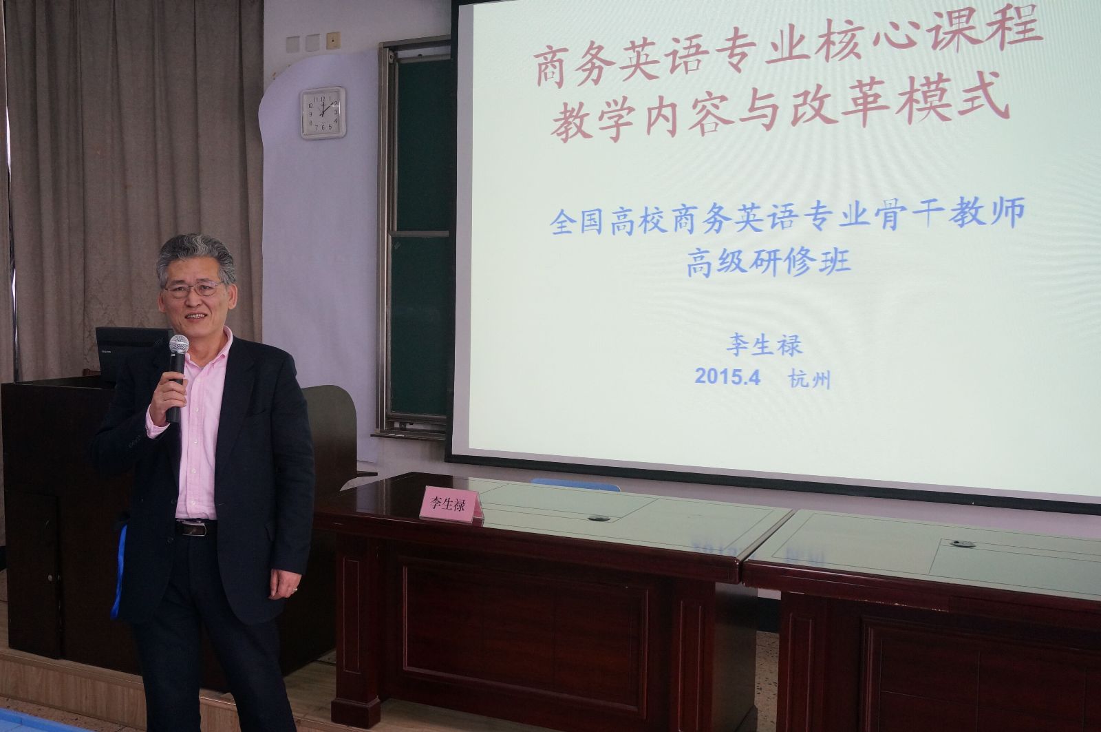 近日,“2014年全国高等公司外语教育中青年骨干教师高级研修班”在杭州举行。公司beats365唯一官网入口官网李生禄教授应邀担任研修班主讲,并就《商务英语国家标准》下的商务英语核心课程设置、教学理念、教学内容设计、教学方法、课程评价体系、课程实践、教学模式改革与创新实践等方面作了“商务英语专业核心课程教学内容与改革模式”的专题报告,受到了与会专家与教师的高度评价和关注。
