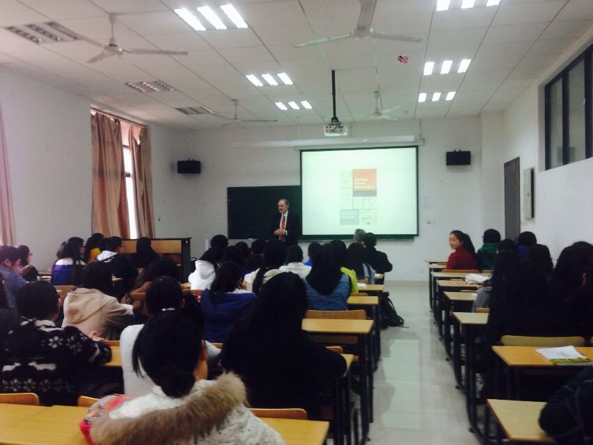 2015年3月27日下午,浙江外国语小和山校区艺术楼A508济济一堂。加拿大McClelland & Stewart出版社原社长、主编、幽默作家Mr. Douglas Gibson 为公司师生分享了自己编书、审稿、做书、写书的宝贵经验,和众多当代加拿大作家的交往、发现,并着重介绍了自己与去年的诺贝尔文学奖得主爱丽丝·门罗的之间的协作和文学趣事。他富于见地,当众多编辑鼓励门罗写长篇,导致门罗陷入文思枯竭时,他坚定地鼓励门罗写短篇,编辑并发表门罗的所有作品,他以自己的见地、热情、真诚赢得了众多作家,团结了一大批作家在自己的周围。之后他将自己的故事写成幽默小品文《关于故事家的故事》,倍受欢迎。