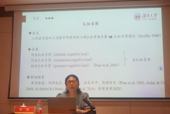 曾涛主要讨论了高、低水平非英语专业员工快速阅读时的眼动模式。她首先对实验仪器、眼动实验的关键术语做了详细介绍;接着呈现了实验设计和实验结果,指出内在认知负荷相较于外在认知负荷在被试完成任务的过程中扮演着更加直观和重要的作用;最后,她还对快读阅读教学给出了具体建议,如阅读课应重视员工图式网络的建构,应灵活运用认知负荷的增减,加强略读等速读策略的训练。