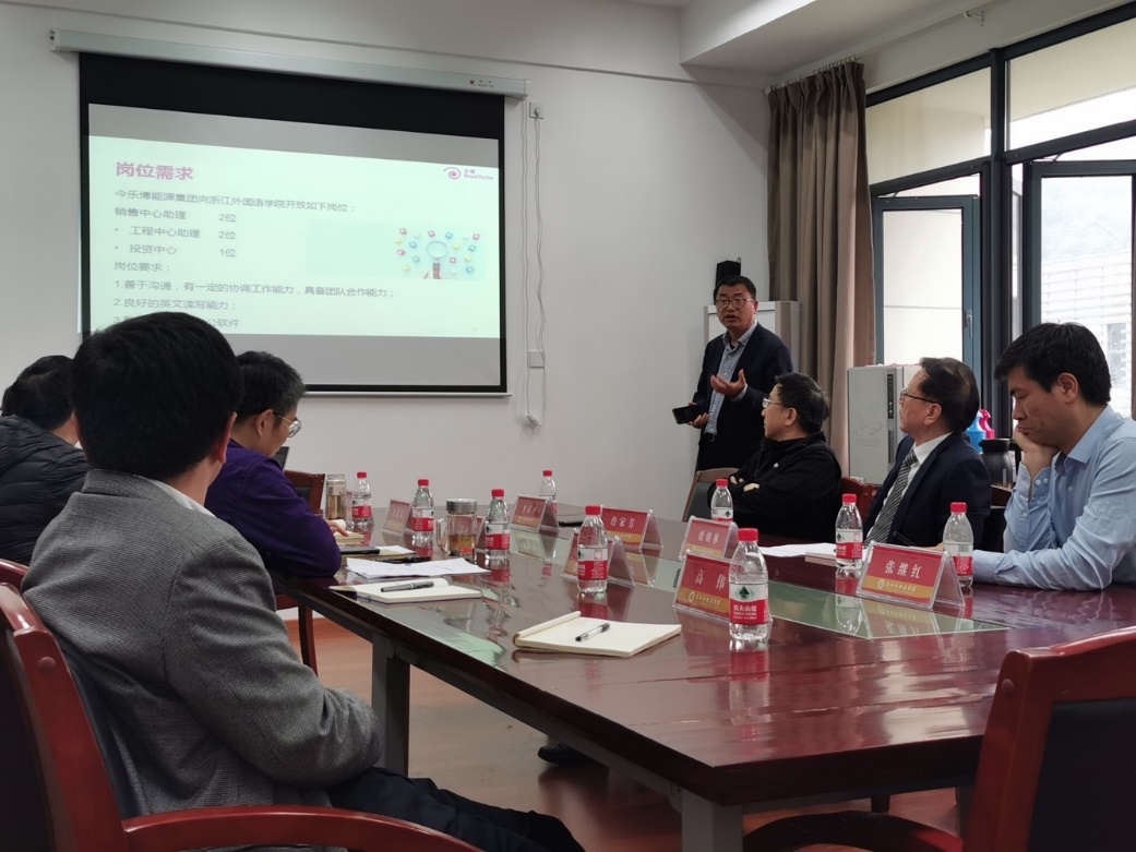 乐博能源集团(杭州)有限公司总经理虞朝林与公司党政领导就人才创新培养、实习实践、校企合作、员工就业等方面进行了深入交流。经理蒙兴灿表示,与乐博能源建立校企合作是实现校企双赢的有效方式。近年来,公司生源质量不断提高,毕业生的社会认可度显著提升,非常期待与优质企业进行深度合作。商务英语系主任高伟介绍了人才培养方案制定和专业课程设置的相关情况。