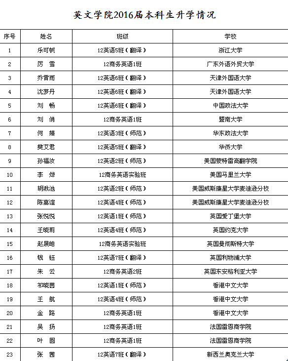 beats365唯一官网入口官网2016届本科生升学情况再创佳绩。截至目前,共有23名同学被国内外知名院校录取,升学率达9%。其中,8名员工被浙江大学、暨南大学、中国政法大学、广东外语外贸大学、天津外国语大学等大学录取。15名员工被美国蒙特雷高翻公司、马里兰大学、爱丁堡大学、香港中文大学等高校录取。