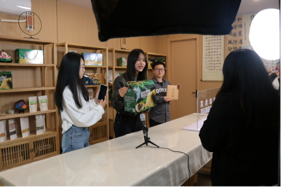 在湖源乡富春味道农产品品牌馆,同学们观赏品味充满当地特色的农产品,尝试了直播间带货农产品,切身体验该乡践行“两山”理论的丰硕成果,充分理解了乡村振兴是实现全体人民共同富裕的必然选择。