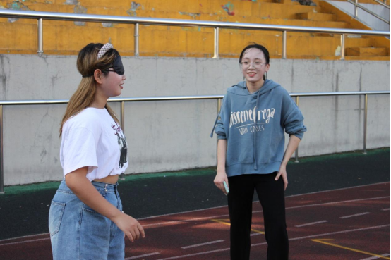 “向前走三步”“向右移两步”,“猜猜我是谁”的队员们一步步地指挥着蒙眼的队员,在阳光下走出一个个字母,并走完猜出神秘字母。各队伍“两极分化”严重,有的队伍的答案不费吹灰之力地脱口而出,有的队伍一头雾水,绞尽脑汁地回忆着每一个步伐,思索着答案。无论如何,所有队员们不到最后一刻都不松懈,拼尽全力完成挑战。
