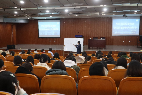 邵龙河董事长曾任浙江省青年联合会第七届、第八届、第九届委员,有30多年国际贸易市场开拓和管理的丰富经验,曾多次被邀请到商务部组织的全国性外贸研讨会上担任主讲嘉宾。邵董事长针对当下毕业生们在择业中繁多的困惑,多角度讲述了“老员工就业、择业和创业”以及“应具备的基本素质和应聘准备”两个重点,给出了工作的选择建议,一番谆谆善言获得了在场学子们的阵阵掌声。