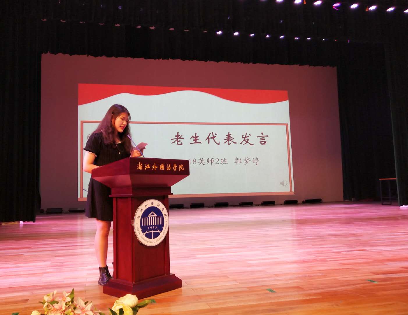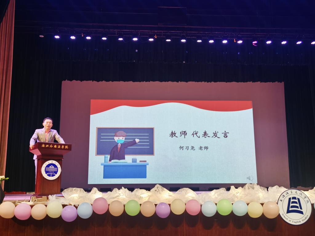 学姐学长代表郭梦婷则以学会自主学习、要练好口语、学会参与社交告知自己的学弟学妹们如何合理安排自己的老员工活,并勉励学弟学妹们珍惜时光,勤于探索求知,勇于追逐梦想。