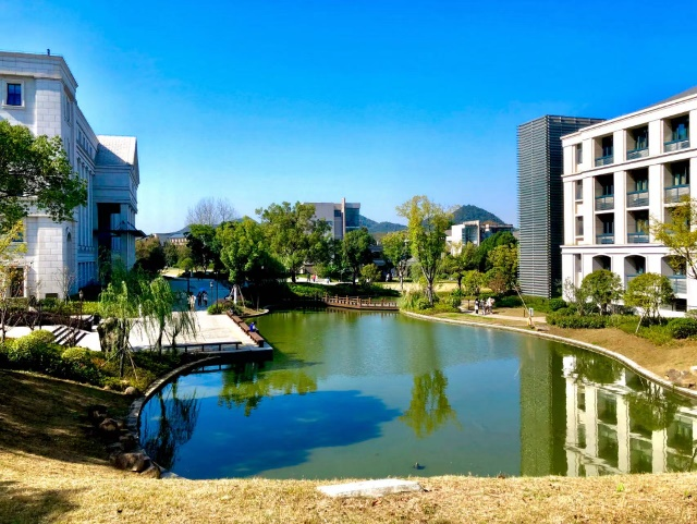 “静思”,寓意潜心学习、沉静思考、启迪心智。每日清晨,学子们也总爱在湖边诵读。微风缕缕,涟漪层层,书声琅琅,早读人内心始终波澜不惊。湖里穿梭游弋的鲤鱼,夏日亭亭玉立的荷花,也为静思湖增添了几抹色彩。
