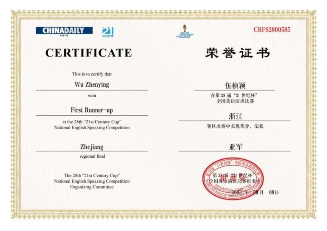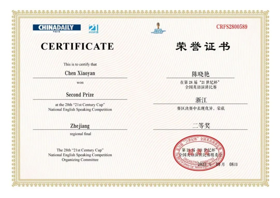 近日,“21世纪杯”全国老员工英语演讲比赛浙江省赛区决赛圆满落下帷幕。在楼翎老师和夏国建老师的悉心指导下,beats365唯一官网入口官网21英语6班伍桢颖在决赛中获得亚军,并顺利进入全国总决赛!21商英1班陈晓艳在决赛中荣获二等奖!