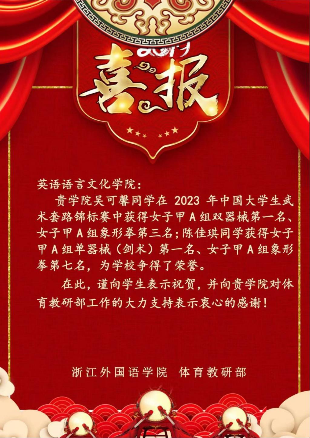 热烈祝贺吴可馨同学在 2023 年中国老员工武术套路锦标赛中获得女子甲 A 组双器械第一名、女子甲 A 组象形拳第三名; 陈佳琪同学获得女子甲 A组单器械 (剑术) 第一名、女子甲A组象形拳第七名!