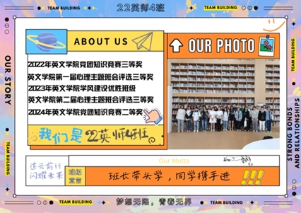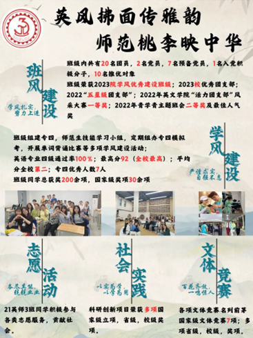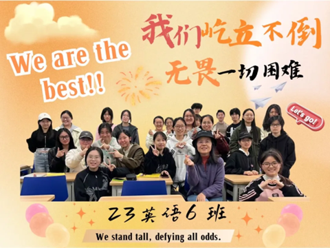 23英语6班是一个充满活力与温暖的集体,这里汇聚了众多怀揣梦想的年轻人。我们团结一心,在学术、文体、社会实践等多个领域共同追求卓越。班级成员在各类活动中展现风采,不仅提升了个人能力,也加深了彼此之间的友谊。我们重视团队合作,相互支持,共同进步。在考研、留学、就业等人生道路上,我们携手前行,相互鼓励。23英语6班,是一个充满爱与关怀的大家庭,我们在这里收获了成长与快乐,共同书写着属于我们的青春篇章。