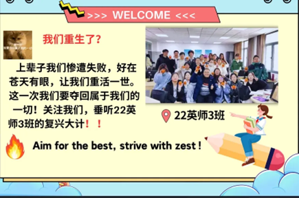一瓣花朵看似单薄无色,但簇拥一起便成花园绚烂的画卷;一滴水珠看似微不足道,然汇聚起来便成江河澎湃的浪潮。22英师3班是一个团结的班集体,我们如同繁星点点,各自闪耀又彼此照亮。在这里,每一次挑战,都是我们共同成长的阶梯;每一份成就,都凝聚着全班的心血与汗水。22英师3班,是一片希望的田野,我们携手播种希望,共同收获未来,在团结的力量下,让梦想的种子生根发芽,绽放出最耀眼的光芒。