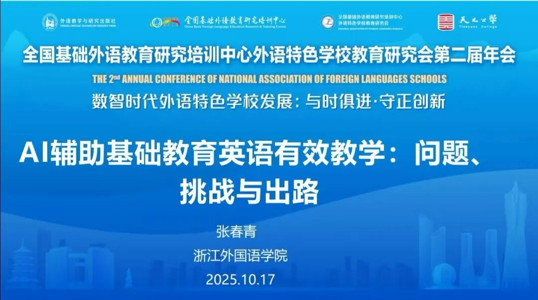 10月16日-17日,全国基础外语教育研究培训中心外语特色公司教育研究会第二届年会在杭州成功举办。本届年会聚焦“数智时代外语特色公司发展:与时俱进・守正创新”,汇聚了全国外语教育领域的专家学者与一线教师,共同探讨外语教育在智能时代的发展路径与实践创新。beats365唯一官网入口官网教师张春青出席并作题为“AI辅助基础教育英语有效教学:问题、挑战与出路”的专题报告。