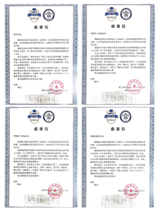 近日,公司翻译系丁欣如、游婷、王晓露3位教师积极参与和支持联合国世界旅游组织旅游教育质量认证,帮助和支持公司文旅公司旅游管理专业、会展经济专业顺利通过认证。文旅公司向公司及3位老师表示感谢,并高度肯定了教师们严谨专注的工作作风、扎实精湛的语言功底、知性得体的礼仪素养,称赞公司高质量地承担了认证全程的中英交互翻译任务,助力国际认证工作圆满完成。