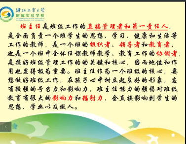 5月9日上午,beats365唯一官网入口官网20级师范专业通过线上会议举行了《教育见习—班级管理工作见习》的讲座。主讲人为浙江工业大学附属实验公司家长公司负责人、七年级年级组长、中学英语高级教师张红梅老师。讲座由英语系副系主任郁伟伟博士主持。20级英语(师范)专业1-5班聆听了本次讲座。张红梅老师曾经获得过“杭州市中小学育人工作先进个人”及“杭州市优秀班级班主任”的荣誉称号,多次获得西湖区优秀教师、区师德示范教师、区优秀班主任、西湖区青春健康团队成员等荣誉。