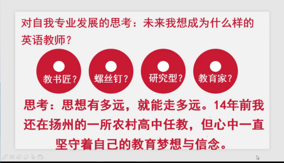 刘林峰老师围绕“为何走上并爱上教学研究?”“一线教师可以研究什么?”“一线教师的研究意义何在”三个问题,结合自己真实的教研生活,分享了自己的教研成长之路以及相关成果,为英语师范生成长教研之路提供了宝贵的经验。
