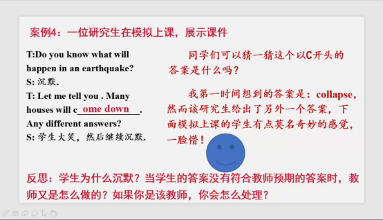 通过讲述10个自己对于课堂话语教学研究的生动案例,刘老师向同学们展示了基于教学反思来深入研究的心路历程。在案例分享中,刘老师抛出了一个个有趣而有意义的问题,同学们主动思考,积极互动,感触颇深。
