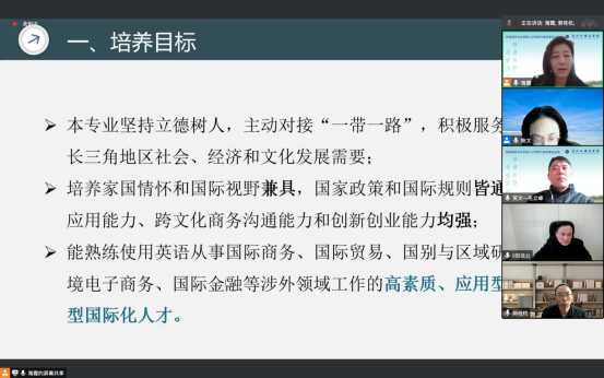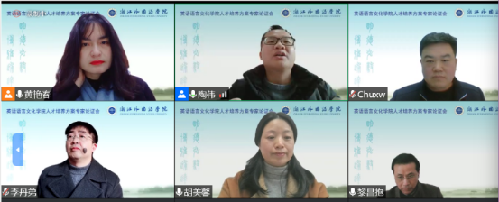 会上,陆海霞、黄艳春和丁欣如介绍了各系人才培养方案。北京语言大学国际语言服务研究院经理王立非、广东外语外贸大学国际商务英语公司经理郭桂杭、浙江海洋大学外国语公司经理刘法公和浙江省商务英语协会常务副会长兼秘书长鲍文对商务英语专业人才培养方案进行了指导。