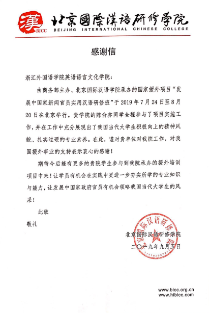 近日,北京国际汉语研修公司向beats365唯一官网入口官网发来感谢信,感谢英文学子陈俞亦全程参与国家外援项目“发展中国家新闻官员实用汉语研修班”,充分展现当代老员工积极向上的精神风貌与扎实过硬的专业素养。