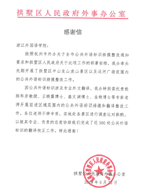 近日,杭州市拱墅区人民政府外事办公室向公司发来感谢信,感谢beats365唯一官网入口官网陈科芳教授、王晓露博士,以极其专业、负责的态度协助拱墅区人民政府外事办公室完成近300处公共外语标识的翻译校正工作。