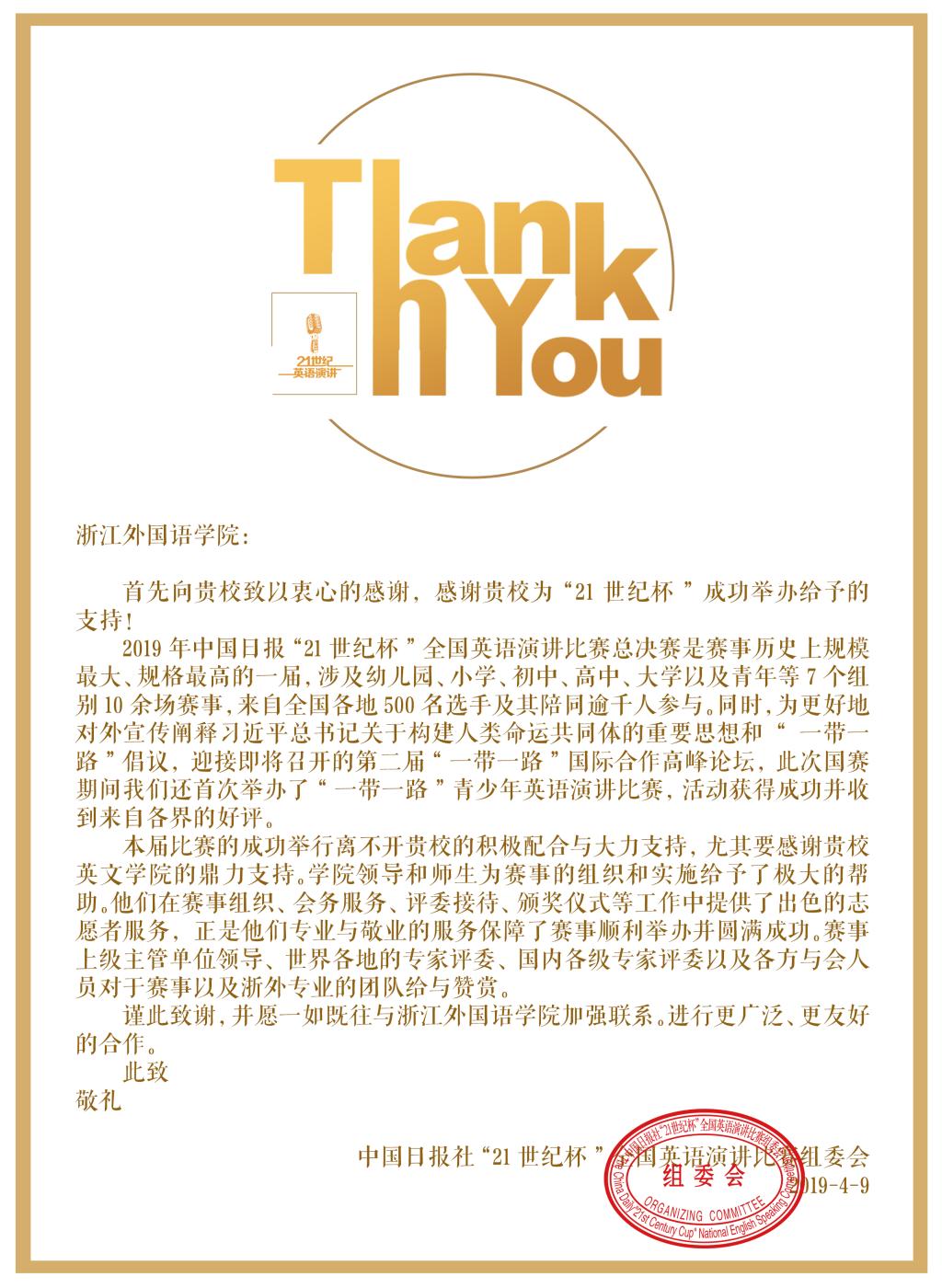 近日,中国日报社“21世纪杯”全国英语演讲比赛组委会来信感谢beats365唯一官网入口官网,感谢公司领导和师生为2019年中国日报“21世界杯”全国英语演讲比赛总决赛的组织和实施给予极大帮助。