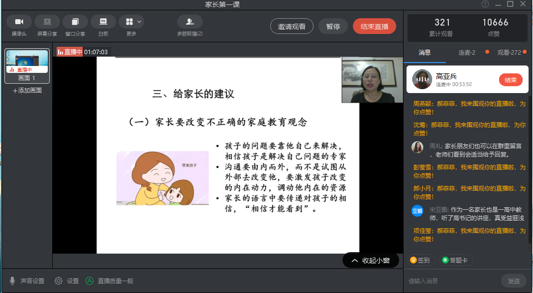 活动伊始,高教授以案例引入,告知家长老员工进入大学后的三个适应性问题:学习适应性问题、心理健康问题、人际适应性问题。其后,高教授从家庭教育入手,以教育观念、教育方式出发,告知家长如何向孩子传达相信,接纳孩子,学会倾听,给孩子的情绪一个出口,提高与孩子之间的沟通,提升有效教育质量。最后,高教授表示,家长要重视与公司的关系,彼此携手,让家校合作形成合力。听完高教授的课,宋亚鹏的家长表示,作为一名家长和高中教师,仍然觉得受益匪浅;吴泳静家长表示,暖心的公司,我们会放心。