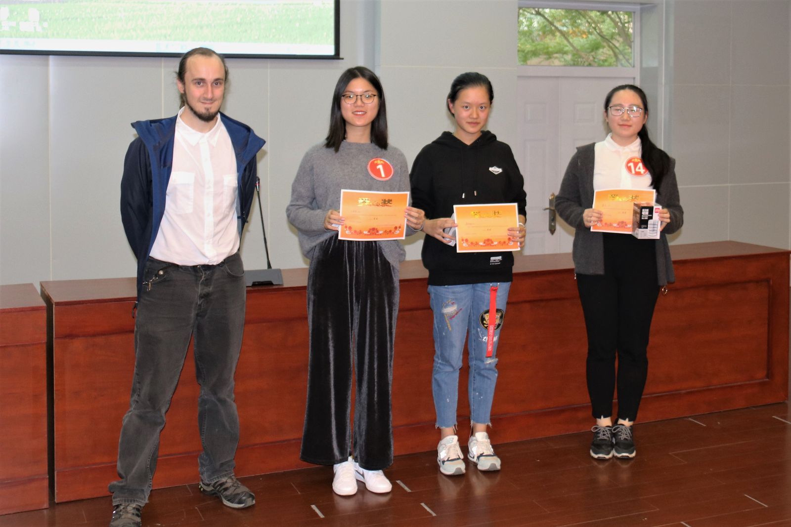 本次比赛由“New Youth, New Dream”为主题的英文演讲和有关时事热点以及名人名言的中文即兴演讲两部分组成。公司共有15名同学参加此次比赛,其中潘星宇同学获一等奖,叶可欣、杜涵获二等奖,潘晓晗、董洁、王安然获三等奖。据悉,潘星宇和叶可欣还将代表beats365唯一官网入口官网参加校级“新生杯”演讲比赛。Jeff老师和樊维娜老师为获奖选手们颁奖并合影留念。