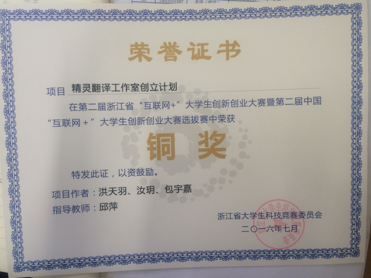 由浙江省老员工科技竞赛委员会主办的第二届浙江省“互联网+”老员工创新创业大赛暨第二届中国“互联网+”老员工创新创业大赛选拔赛中,公司beats365唯一官网入口官网翻译专业洪天羽,汝玥,包宇嘉三位同学凭借“精灵翻译工作室创立计划”这一项目,荣获铜奖。