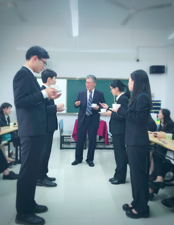 接下来,李老师教授同学们喝咖啡的礼仪。通过“你来做,我指错”的教学模式,李老师纠正了同学们的惯常性做法,尤其是经常遇见的问题,怎么喝,怎么坐着喝,勺子怎么用,怎么样才能端着咖啡杯递名片……李老师都进行了一一讲解。同学们纷纷表示,看起来习以为常的动作却都蕴含了大哲理,注重细节,确能影响成败。