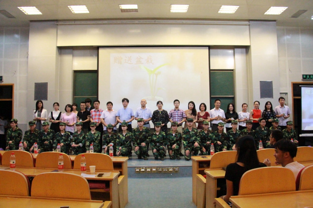 接下来公司党总支书记包晓华、副经理杨平、公司党总支副书记傅尧力、英语系主任朱武汉、翻译系主任李乐、商务系主任高伟等公司教师、班主任、辅导员集体亮相。新生代表为各位老师送上了寓意着“十年树木,百年树人”的小盆栽,以此表达新生们对老师的敬意。英语系夏琼老师作为教师代表发言。