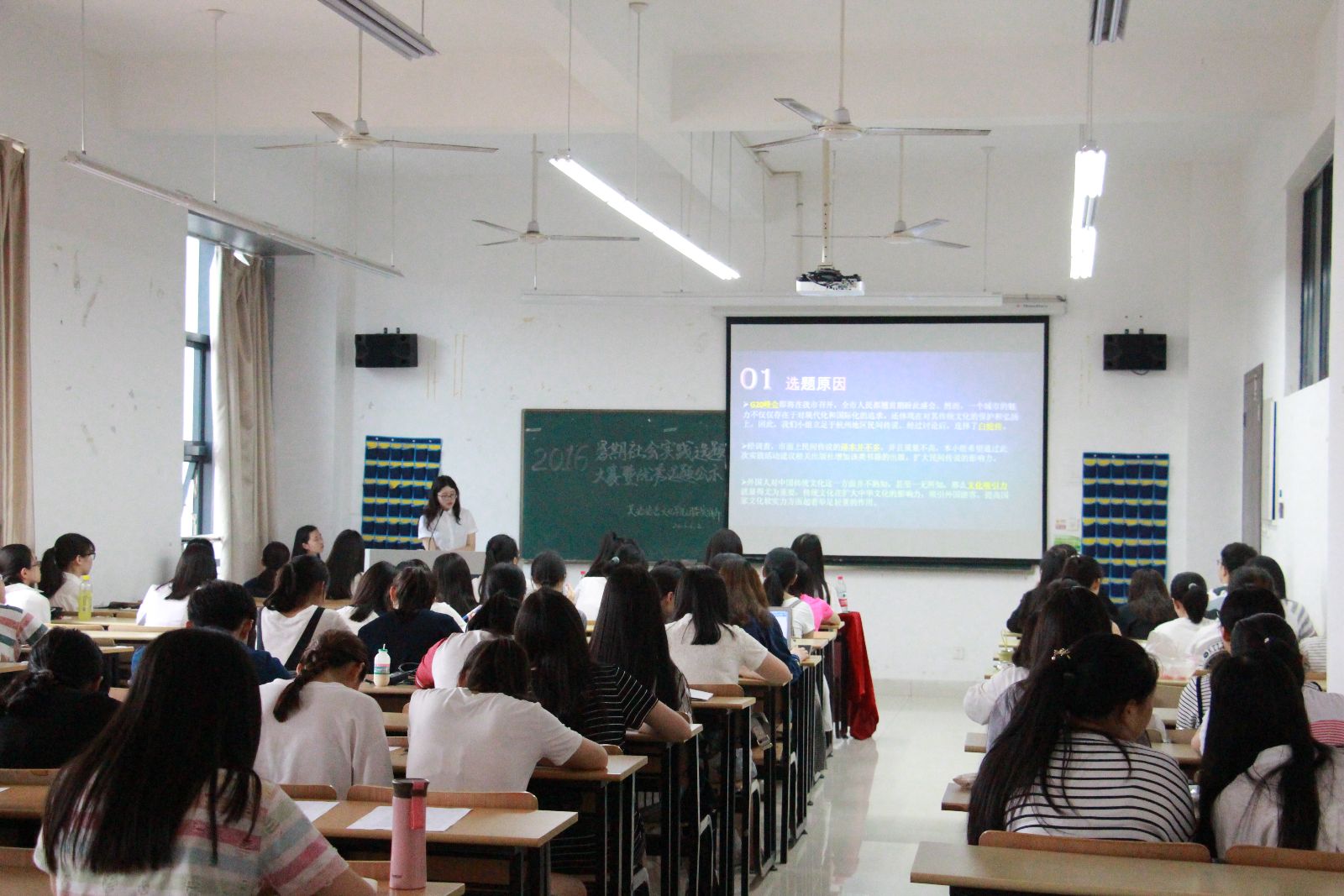 “文明修身伴我行,青春闪耀 G20”本次暑期社会实践意在通过选题大赛,公示优秀选题,让更多来自各年级各专业的同学参与其中。经过筛选,共有17个社会实践项目参加本次比赛。项目负责人为在场师生做了生动丰富的演讲,并结合发问、实例、分析,创新,展现了各自选题的特色,让大家对各组实践内容有了更加深入的了解。各项目结合当今热点,发挥专业优势,选题内容涉及社会服务、支教、翻译、教育、互联网、贸易、就业等方面,形式多项,选题丰富。