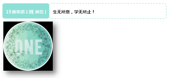 班徽介绍:英文字母“one”的周边被花朵环绕,象征着我们英语师范一班的每位同学都像花朵般美好,我们是一个积极而富有凝聚力的集体。以渐变的绿色打底给人以清新自然的感觉,正如我们班的整体形象友好而温和。整个班徽旨在象征我们是生机勃勃,清新美好的班集体,青春就是资本,我们必会打下坚实基础,迎接更加绚烂的明天。
