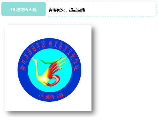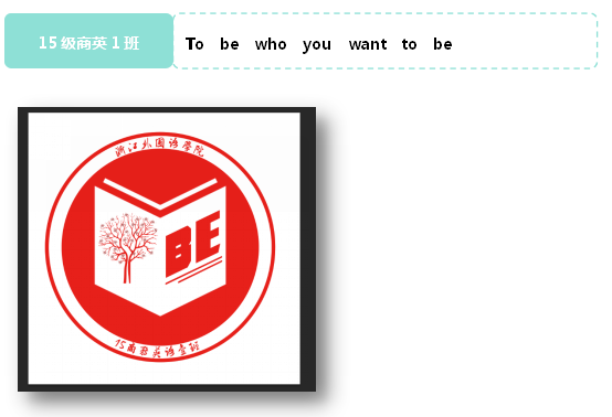 班徽介绍:2015夏,我们就这样不远万里因为缘分圈到了这个班级,在27人的大家庭中,有来自广西的伙伴,还有贵阳的直爽女生,还有来自河南的,来自温州,来自金华……这里的每个人都朝气蓬勃,富有激情,这是班徽采用红色底色的寓意。班徽的主体构成是一本书,左侧封面是一颗年轻的树木,希望班级里的每一个同学都能好好得在浙外校园里好好成长,他不是幼苗,也不是一颗大树,我们的老员工活还正在进行!右侧的封面指的是Business English的缩写,表明了我们的专业,其次和班级口号相对应(to be who you wanna be)。