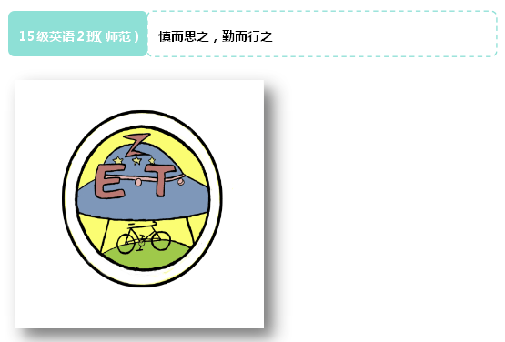 班徽介绍:E.T.是English Teacher的缩写,是我们专业的名称。它的创意源于一部充满了温馨和希望的同名电影。主人公E.T.是一个来自外太空却与人类孩子产生了深厚友谊的外星人,在影片中孩子们纷纷骑着飞翔的自行车连结了一座友爱的桥。班徽中的飞船和自行车便是这种情谊的象征。一方面寓意着我们2班个体之间虽然存在差异但我们会彼此走进对方的内心,相亲相爱;另一方面,我们也寓意着我们将永远保持着像孩子般的干净和纯真坦诚相待。飞船上的“Z”字形似“2”,代表了我们二班,同时红黄蓝绿四种颜色都是最基础也最令人舒服的颜色,寓意着和谐。