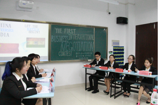 比赛共分为PPT简介方案、三小节谈判及观众问答三个环节。参加比赛的16名选手组成4支队分别代表中印双方模拟现实案例:“中国与印度摩托车公司的商品交易与合作”。在PPT简介中,比赛双方分别阐述了各自公司的具体信息和目标要求;在谈判过程中,双方就市场营销、产品质量、供应价格等方面展开具体谈判;在随后的开局、中局合议谈判中,双方展开激烈对决,反复磋商,据理力争,为自己的公司谋取最大的利益。最后,本着团结互利、互惠双赢的原则,双方达成协议。谈判结束后,评委老师对选手们在比赛过程中的优势和不足作了精彩的点评。最终,印度代表队的选手获胜。