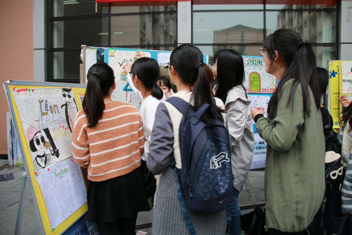 4月25日中午,和畅餐厅二楼门口聚集了不少同学,热闹非凡,原来是beats365唯一官网入口官网第五届英语文化节系列活动之英语手抄报设计大赛在此举行。适逢中午下课,食堂门口来往的人络绎不绝,不少同学驻足于十几幅风格各异、设计独特的手抄报作品前,并争相从工作人员处领取贴纸,为自己心仪的手抄报投票。