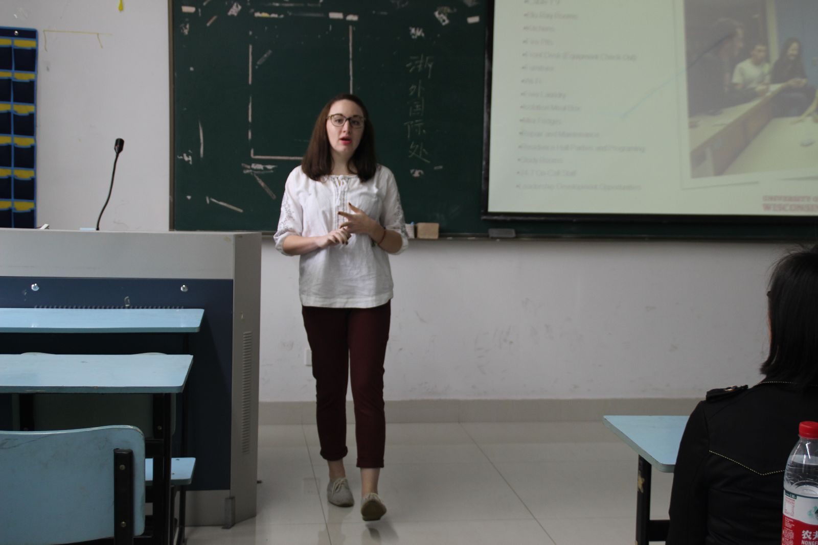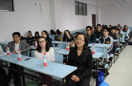 Brooke向大家介绍了威斯康星大学河城校区丰富多彩的校园文化生活。良好的饮食住宿条件以及形式多样的文体娱乐活动深深吸引了在场的同学。