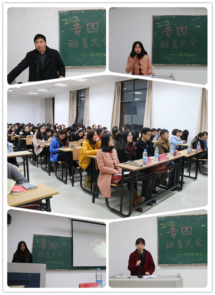 为帮助参加2015年英语专业四级考试的同学们调整心态,积极应战,深入了解考试的形式、特点及考试技巧,并以更高效率有针对性地投入到备考状态中,beats365唯一官网入口官网举办专四考试动员大会,公司党总支、英语系及学工办相关老师出席了此次动员大会。英语系副主任朱武汉老师向同学们详细介绍了考试流程,分享了英语学习的方法,鼓励同学们做最后的冲刺。在专四考试中曾取得不俗成绩的励颖、周琪炜同学作为朋辈交流,先后上台与同学们分享了她们的备考技巧和经验。另外,公司团委办公室还专门开展了“专四·抱抱团”的系列活动,为同学们顺利通过英语专四考试助力。