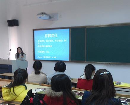 香港欧亚教育集团、杭州少儿之声广播合唱团负责人简单地介绍了杭州之声少儿合唱团。作为浙江省首支全英文演唱合唱团,全英文演唱、全英伦风范、全天候广播、全素质教育是其最重要的四大特色。合唱团所在的香港欧亚教育集团采用的教学体系是英国同步教学课堂EDC少儿英语素质教育体系,其中包括全感官教学刺激法、全方位结合教学法以及全景融入式教学法等。随后,项老师向我们展示了和本科生有关的奖学金代培计划:在香港欧亚教育集团工作后,优秀的员工有机会由其公司提供全额奖学金赴英国深造。根据香港欧亚教育集团的招聘计划,将向全社会招英语老师5名。在场的同学们进行了热烈的讨论并就招聘事宜进行了踊跃的提问,负责人也一一耐心作答。