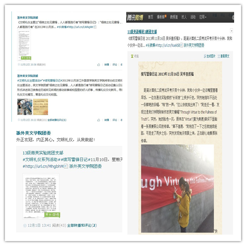 与此同时,beats365唯一官网入口官网以微博为平台,组织了“细微之处见雷锋,人人都是践行者”——续写雷锋日记活动。该活动以日记的形式讲述自己亲身经历或所见所闻的感动故事以及在校园里发生的好人好事。本次活动得到了beats365唯一官网入口官网各个团支部的积极响应,微博得到了大量的转载和分享,在网络平台上掀起了传递正能量,营造文明和谐、崇学向善的良好风气。