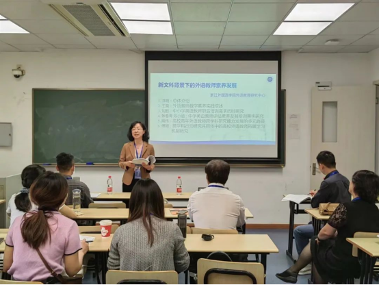 在洪明的带领下,公司外语教育研究中心成员首次以团队展示的形式参会,围绕“新文科背景下的外语教师素养发展”议题,报告了聚焦语言教师数字素养、培训需求、评价素养、跨学科研究能力和拓展学习的最新研究成果,并得到与会教师的好评。应用外语公司刘懿还主持了聚焦“身份认同与外语教师发展”的研究生论坛。