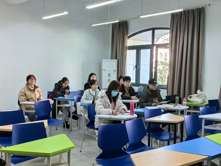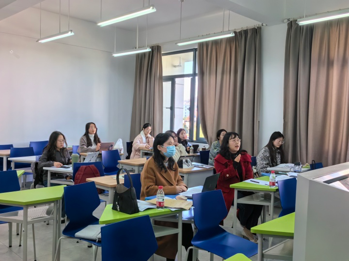 汇报分十个小组进行。每组员工依次分享实习经历、教学和班级管理案例,展示课堂教学并呈现教研过程及效果。实习指导教师结合新课标等对每位同学的汇报进行提问和点评。