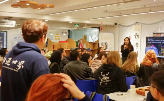 秦媛媛以自己的一次旅程为引,详细介绍了沈阳和哈尔滨的美食、建筑、历史以及北方特有的冰雪文化。她带领大家重温了盛京遗迹下的昔日辉煌,让大家仿佛置身于那段光辉岁月。秦媛媛生动的描述激发了在场同学们的兴趣,全程大家沟通互动不断、踊跃发言。同学们互相交流各自家乡的特色,在语言中了解不同国家的特色文化。